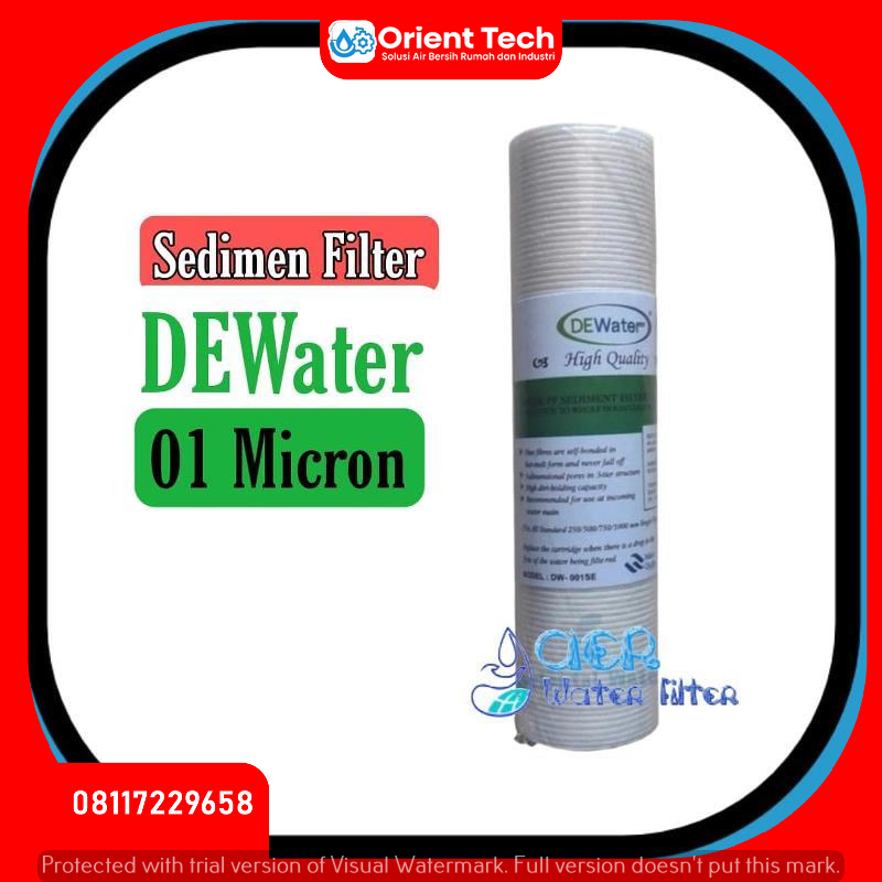 Filter DEWater ini menggunakan teknologi spun polypropylene yang padat, menjadikannya pilihan ideal sebagai Filter Air utama dalam tahap pre-filtrasi. Dengan ukuran standar 10 inci, cartridge ini mudah dipasang pada sebagian besar housing filter standar yang tersedia di pasaran. Tingkat kerapatan filtrasinya yang sangat halus, yaitu 01 mikron, memungkinkannya menyaring partikel yang jauh lebih kecil daripada filter standar.