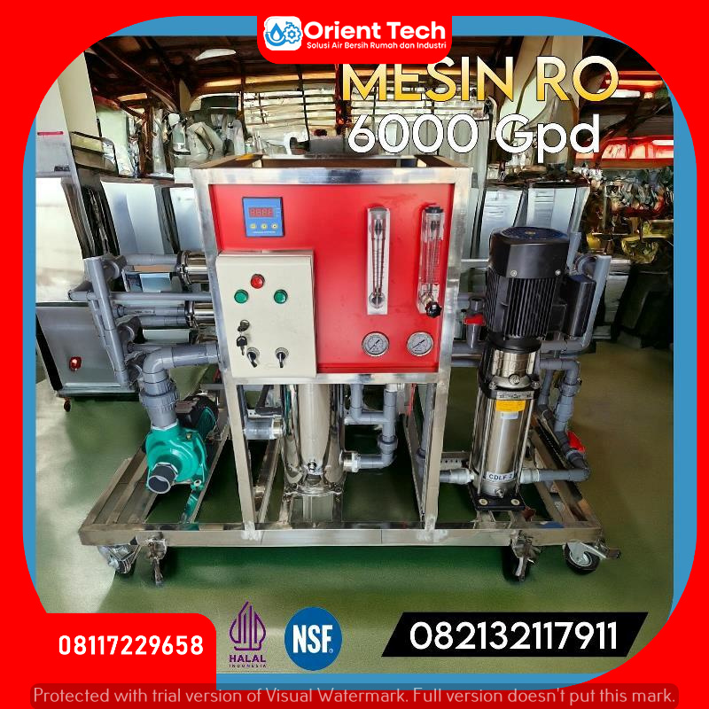 Mesin RO 6000 GPD adalah sistem Reverse Osmosis (RO) industrial atau komersial dengan kapasitas besar, mampu memproduksi air bersih hingga 6000 Gallons Per Day atau sekitar 22.700 liter per hari. Sistem ini dirancang untuk kebutuhan pasokan air minum atau air proses dengan standar kemurnian tinggi di berbagai sektor.