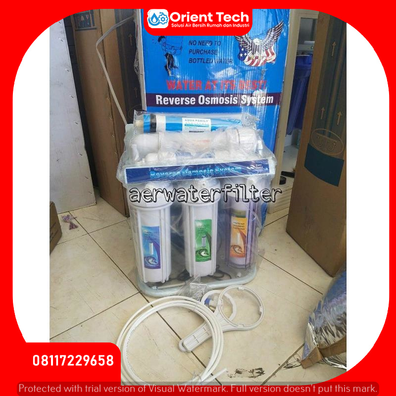 Fitur Tambahan : Dilengkapi booster pump untuk menaikkan tekanan air ke membran, keran air minum siap saji, dan tangki penyimpanan (biasanya 10-15 liter)